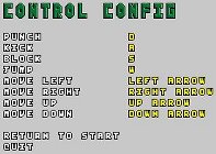 Control Configuration - Allows the user to customize their game controls for each of the different major actions and for any movement using the keyboard. The joystick movement keys are fixed to the axes of the gamepad or joystick. From this menu user can quit the game or return to the start screen. |