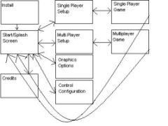 Single player setup- One human player with 2 computer controlled teammates versus a team of 3 computer controlled players. From here the player sets up the map they wish to play, the game mode, team color, and team name. The selection for each of these options is via list boxes such as those used in a typical windows application. There will also be some small windows where items in the window are selected via clicking on them. When the player selects the launch game button the flow moves to the actual single player game with the options the user From this menu the player can quit the game or return to the start menu. |