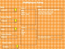 Multiplayer setup- Support for up to 6 human players with computer controlled players filling in any empty slots. From here the player sets up the map they wish to play, the game mode, team color, and team name. There is also a chat window and team setup area where incoming players can choose to switch teams prior to the start of the game. The selection for each of these options is via list boxes such as those used in a typical windows application. There will also be some mini windows where items in the window are selected via clicking on them. When the host player selects the launch game button everyone gets the message to start the game and the multiplayer beatings begin. From this menu the player can quit the game or return to the start menu. |