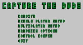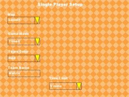 Start/Splash screen - Consists several buttons linking to various game setup screens as single player setup, multi player setup, graphics options, control configuration, and credits. When the player clicks on one of these buttons there is a brief transition and then the new menu/game setup comes up. |