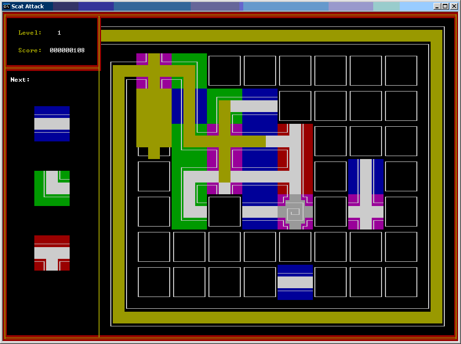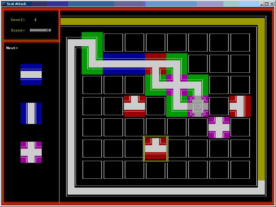 My first year project, is a puzzle game that will challange your mind and speed. You find yourself in a basement with a sewer line directly above you. You can see disgusting green waste filling pipes which are heading straight for you. You only have a few seconds before the contents erupt from the pipe and fill the room. Your challenge is to add new pipes to the line, in order to connect to the drain at the other end of the room. You find that some of the pipes split the flow into multiple directions, creating a complicated network. Try to see if you can stay ahead of the flow. I worked as a programmer/designer on a four person team. My responsibilities included programming the tile-based fluid flow through the pipes and detecting wining or loosing conditions. The program was written to run in a Windows console window using the console API to manage the window and display graphics. I implemented the fluid representation by creating a linked list of flow points that were considered actively flowing. The code had to handle cases when the fluid divided or merged. The code also had to handle pipe configurations which, when represented as a tile grid appear to be closed, though were clearly not joined pipes. The speed of the flow had to be dynamic to account for each time the fluid followed multiple paths. Each time the path divided the fluid had to slow and each time it merged the fluid speed increased. Copyright 2003 (C) DigiPen (USA) Corporation |