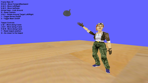 | My Inverse Kinematics project. In this one, you have control over the teapot object. As you move it around, Tiny here reaches for it. I programmatically traverse her skeleton and rotate her bones into an optimal position toward the teapot. The poses are meant to be natural. The reason behind this project was to teach us to create dynamic animations for a boned, skinned model. This was done using C++ and DirectX 9. |