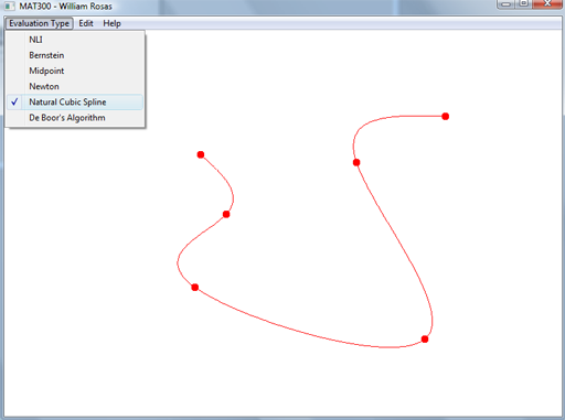 | This project calculates and draws several different curves and splines. Using the mouse, you can place control points and the curve is generated. You can also click and drag the different points and the curve will be updated automatically. This was done using C++. |